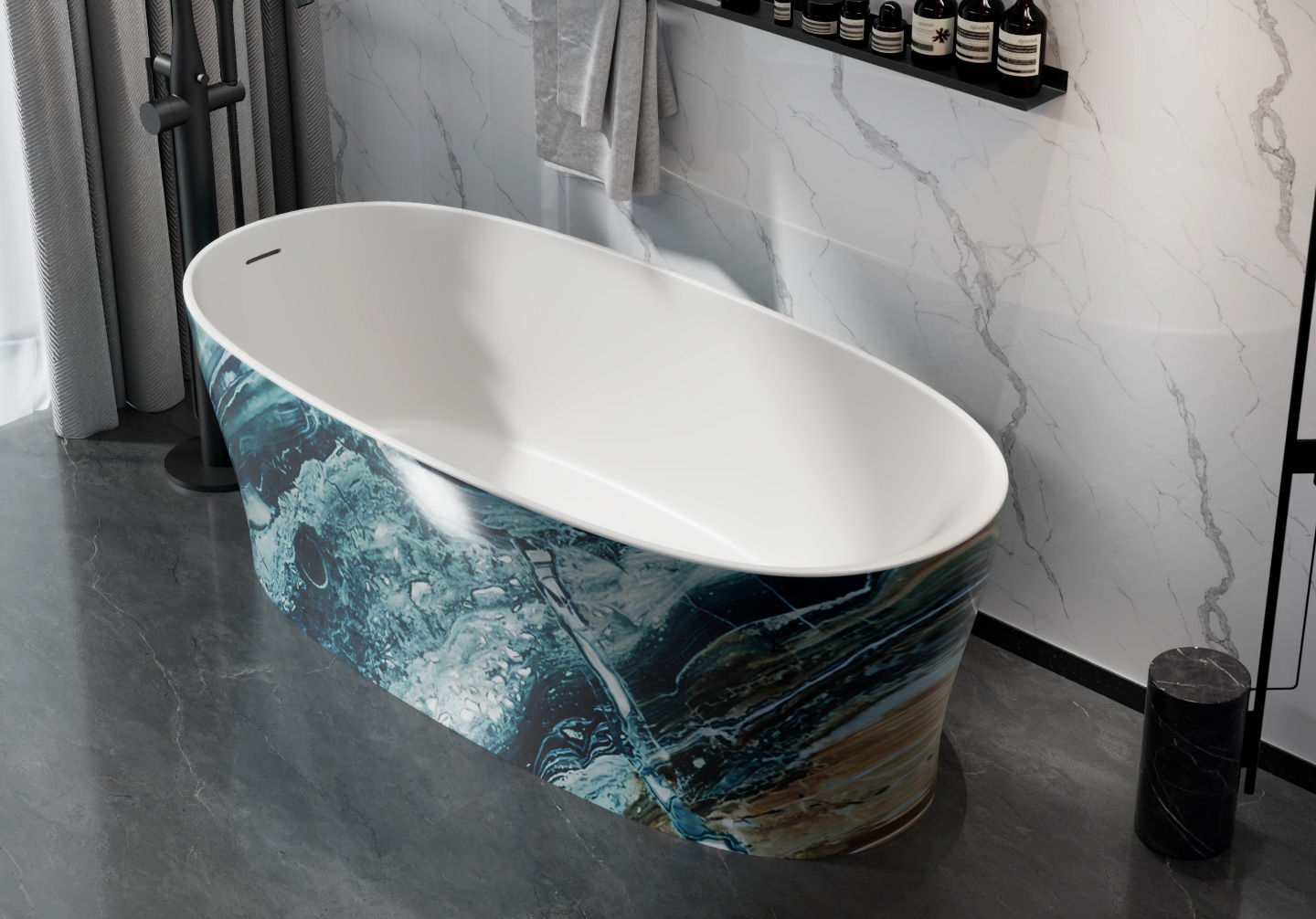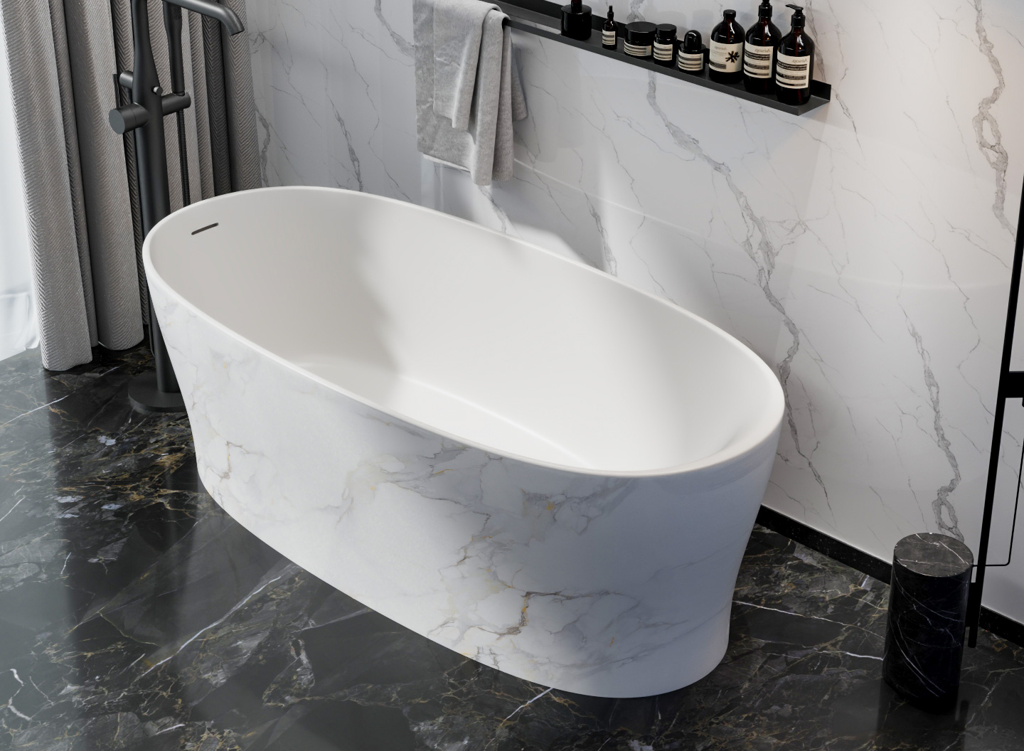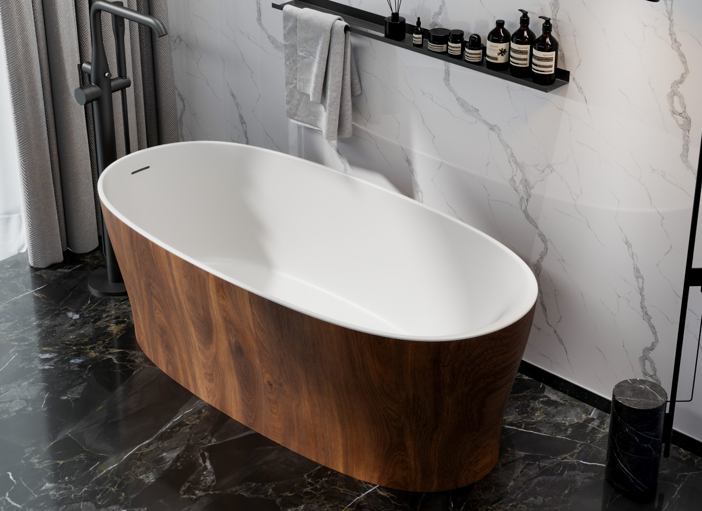 OLEARY 独立式浴缸采用高性能人造石(Solid Surface)材料整体压铸成型,内壁温润洁白,触感如新雪初霁。有别于传统浴缸的固定外观,本款产品允许买家在下单时自主选配外壳纹理,以同一缸型衍生出截然不同的空间气质——大理石的冷峻肌理、深色木纹的沉稳暖意,让浴室成为真正属于你的精神场域。