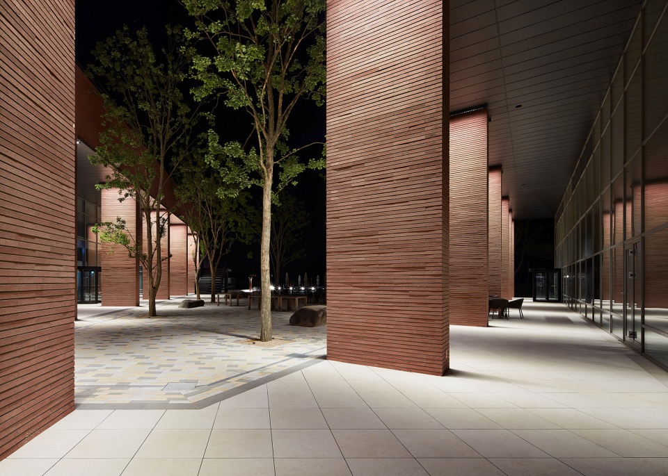 建筑布局舒展,向东西两翼延伸,且四面都向外部环境开放。因此,酒店中的任何一间客房都享有独特的景观视野。建筑的立面强调了楼板的水平线条,并设置了大面积的开窗,在最大程度上保证了建筑的开放性,平面的边缘空间得到了充分的利用,以阳台的形式增添了立面的丰富度。
