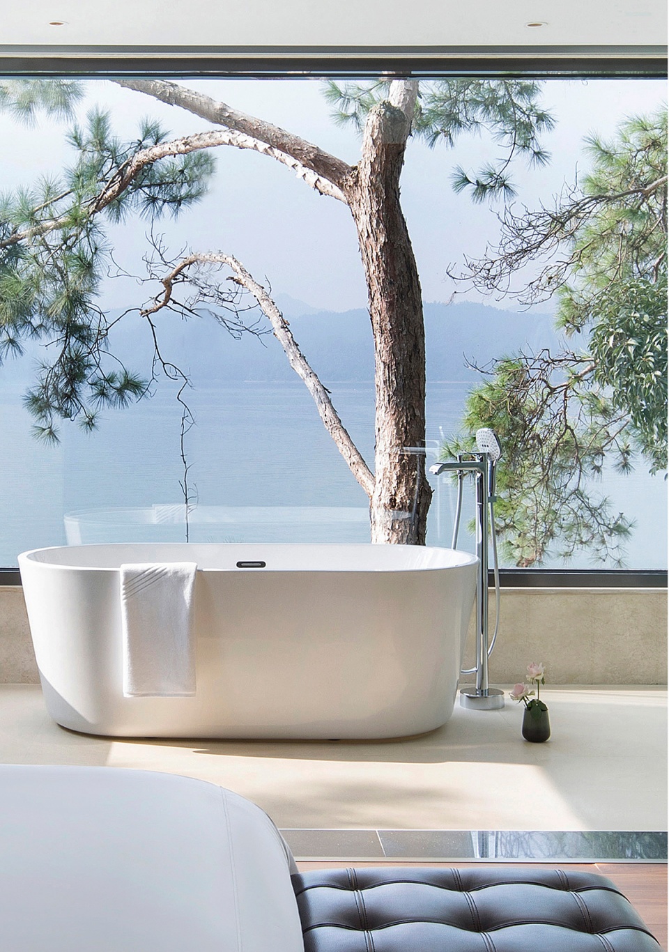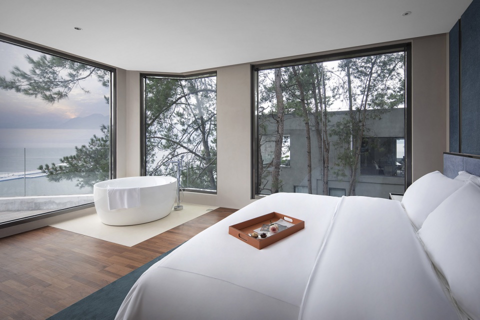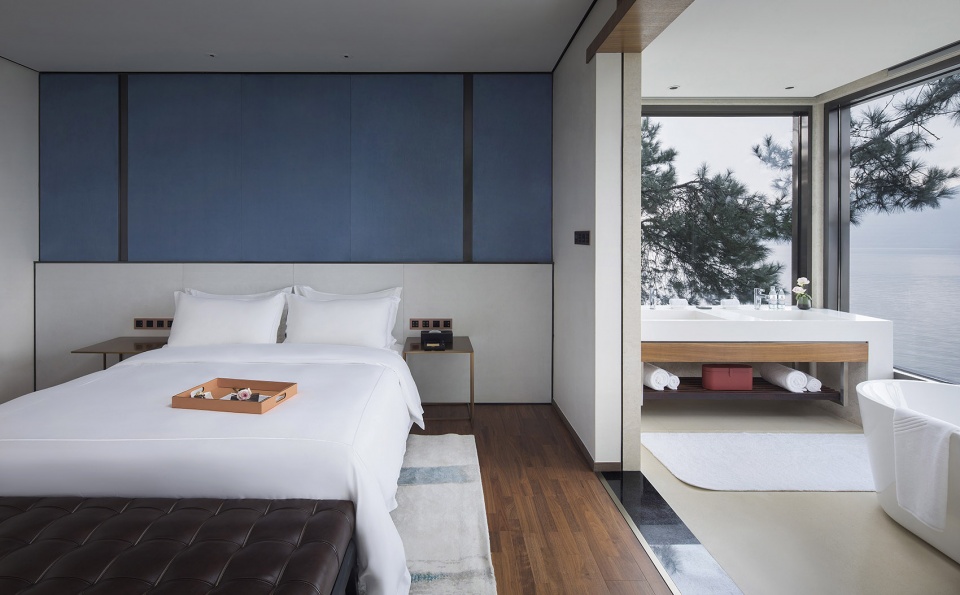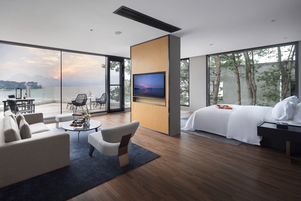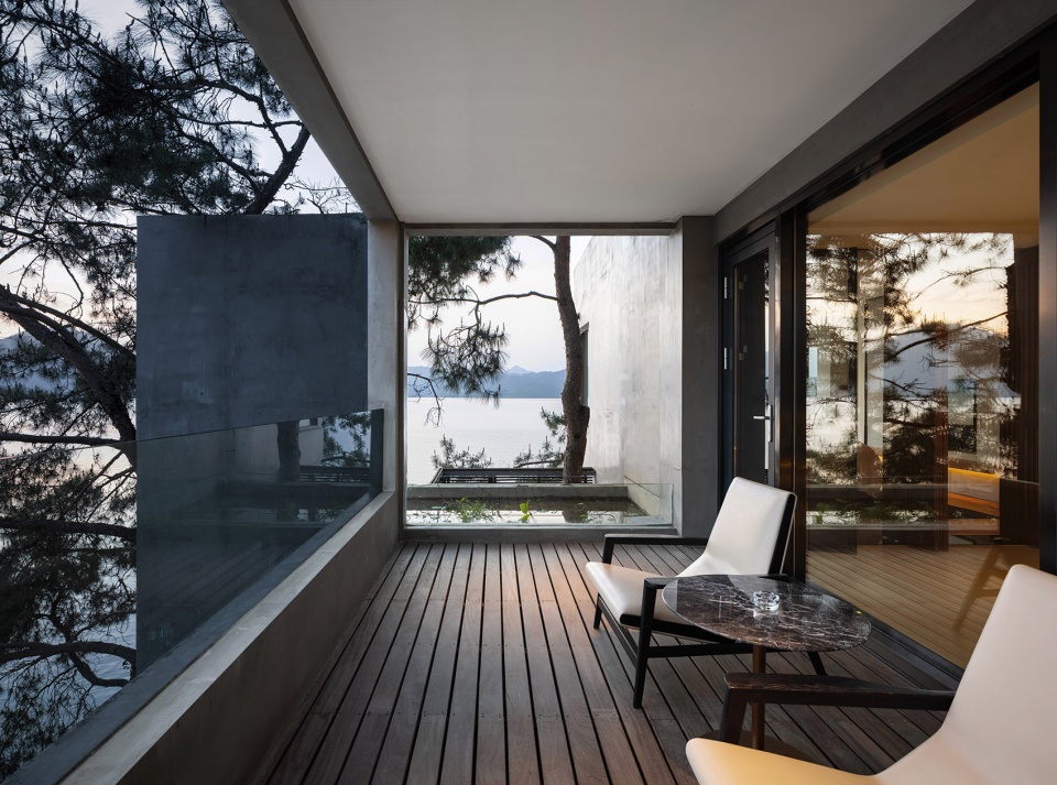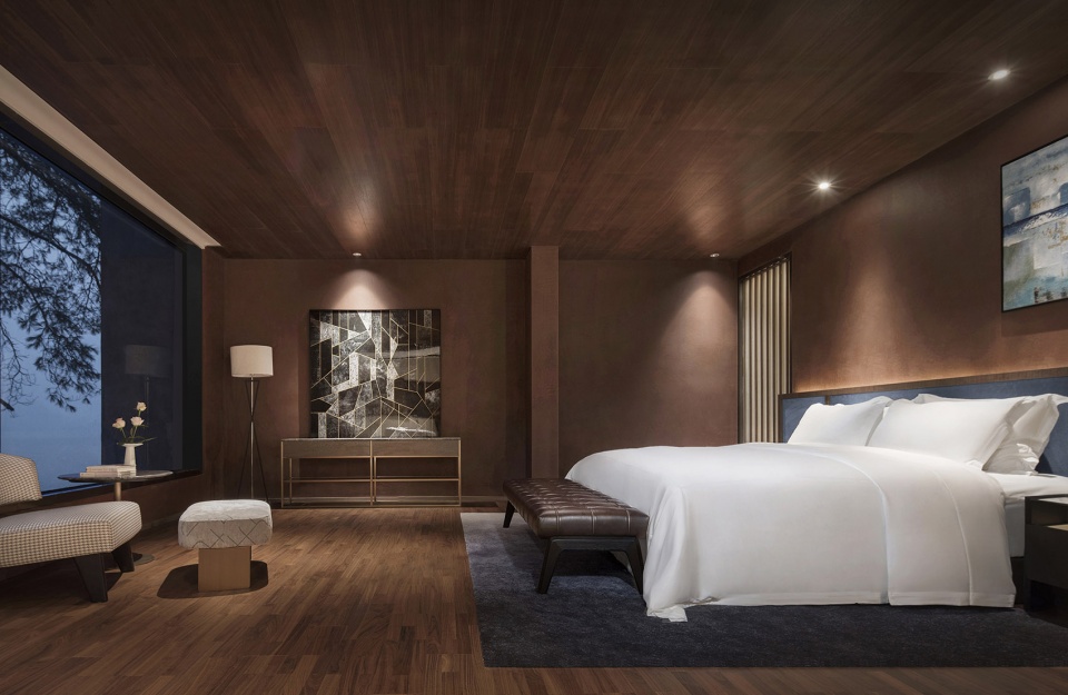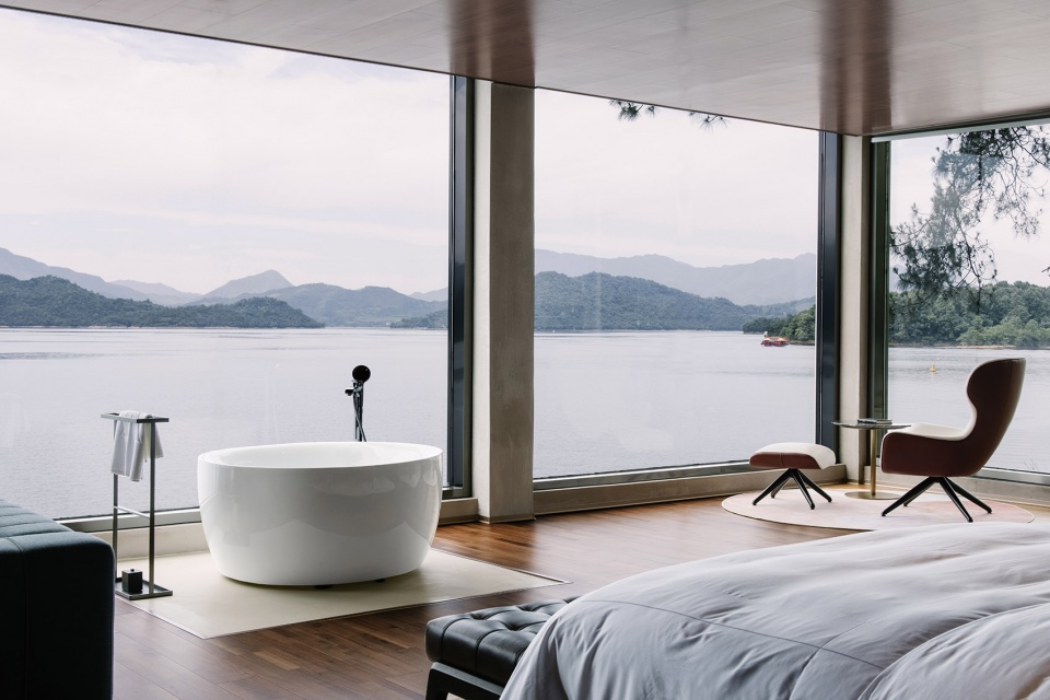 依偎着湖的山水澄澈,酒店成为“东方极简”设计哲学最为浪漫的诠释,也是设计师对于山水自然最为含蓄的情感表达。