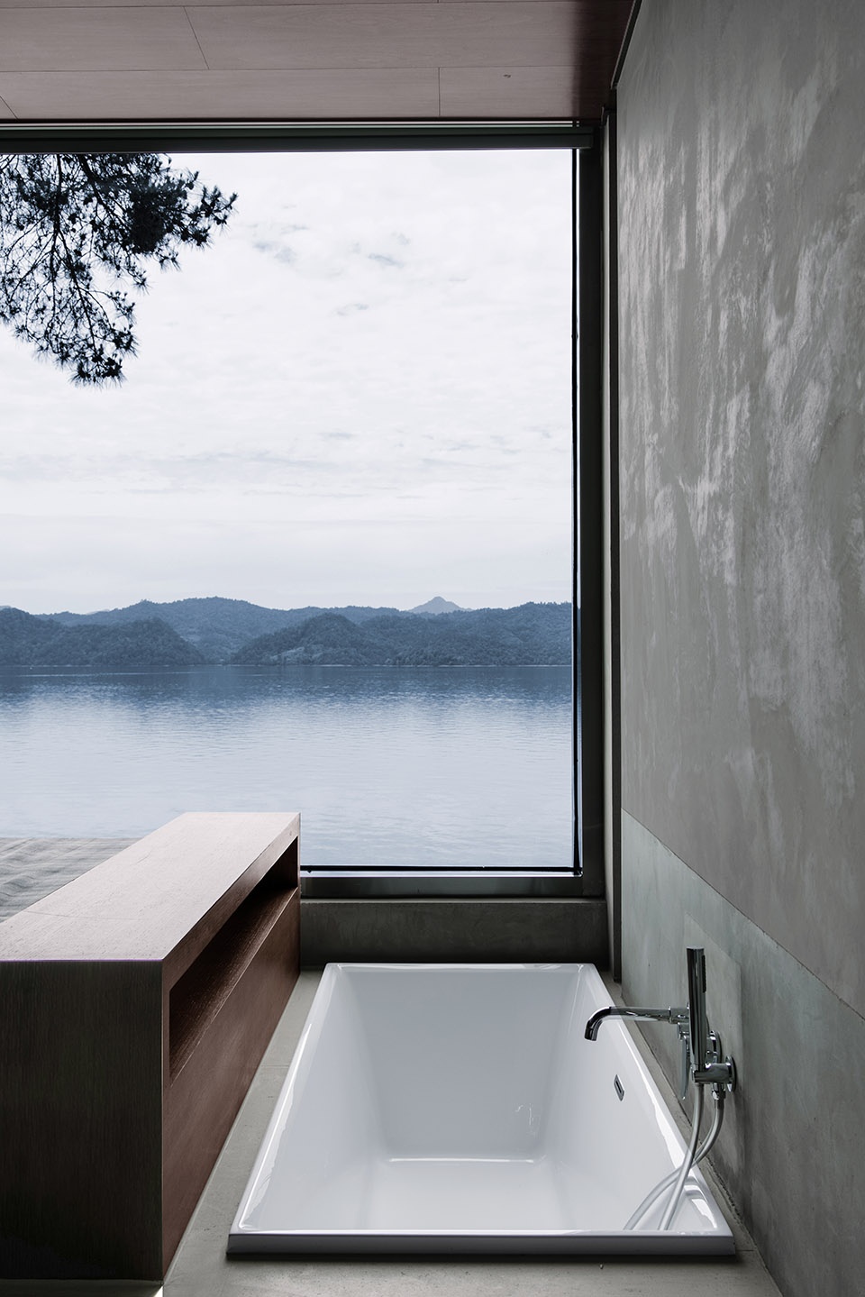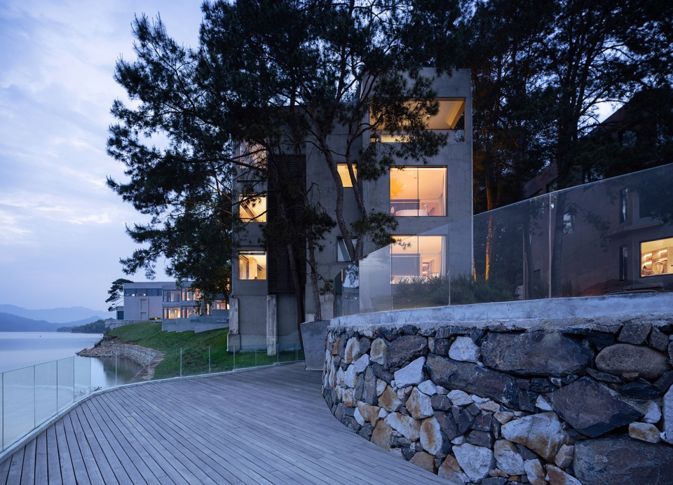 世阿弥说“越隐秘越迷人”,主体的隐匿和不甚完美,却是观者想象力之来源。于是极少主义建筑观望着湖面,粗粝质朴的混凝土、老树和光影交织。