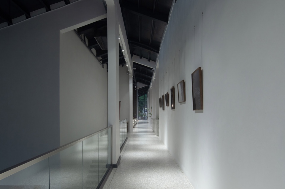 所以最后呈现出来的是一个双坡屋面,既保留了面向河岸一侧延续的屋檐下空间,也降低了临路一侧的尺度感受,屋脊则选择正好落在生产区通道中心的位置,赋予了平时仅仅作为附属次要交通功能的走道空间不一样的尺度感,并通过两侧屋顶剪刀错位交接的方式,形成两道天窗,把自然光引入室内。