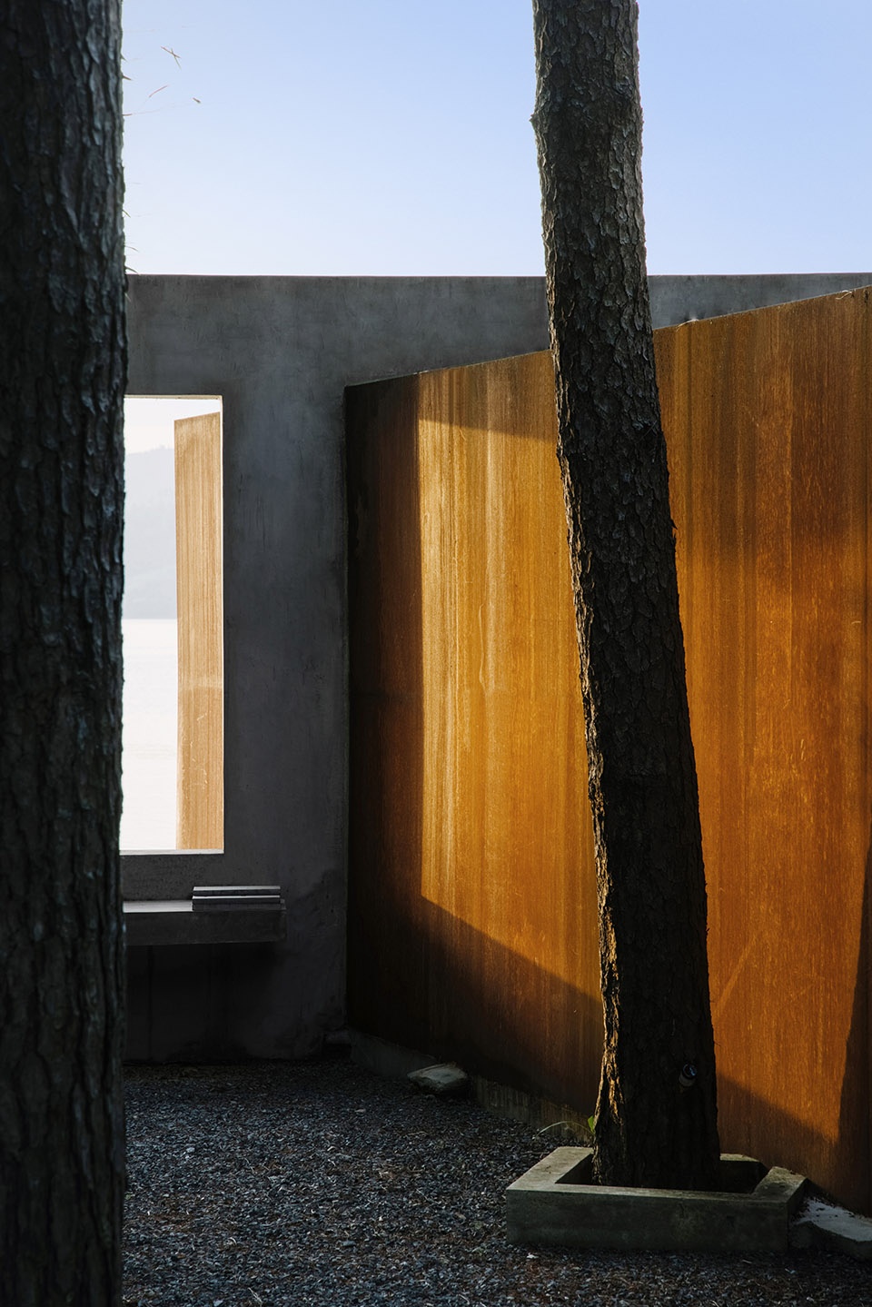 世阿弥说“越隐秘越迷人”,主体的隐匿和不甚完美,却是观者想象力之来源。于是极少主义建筑观望着湖面,粗粝质朴的混凝土、老树和光影交织。