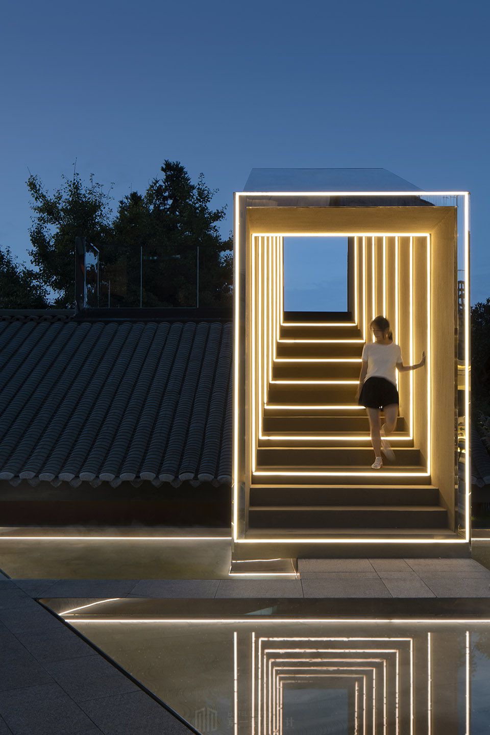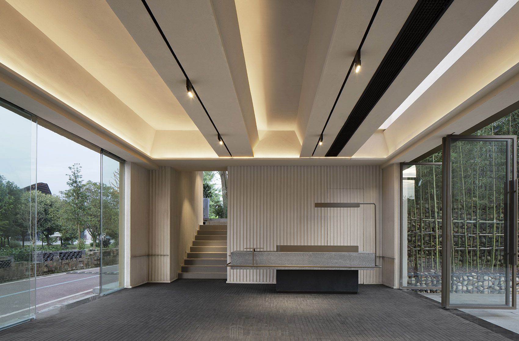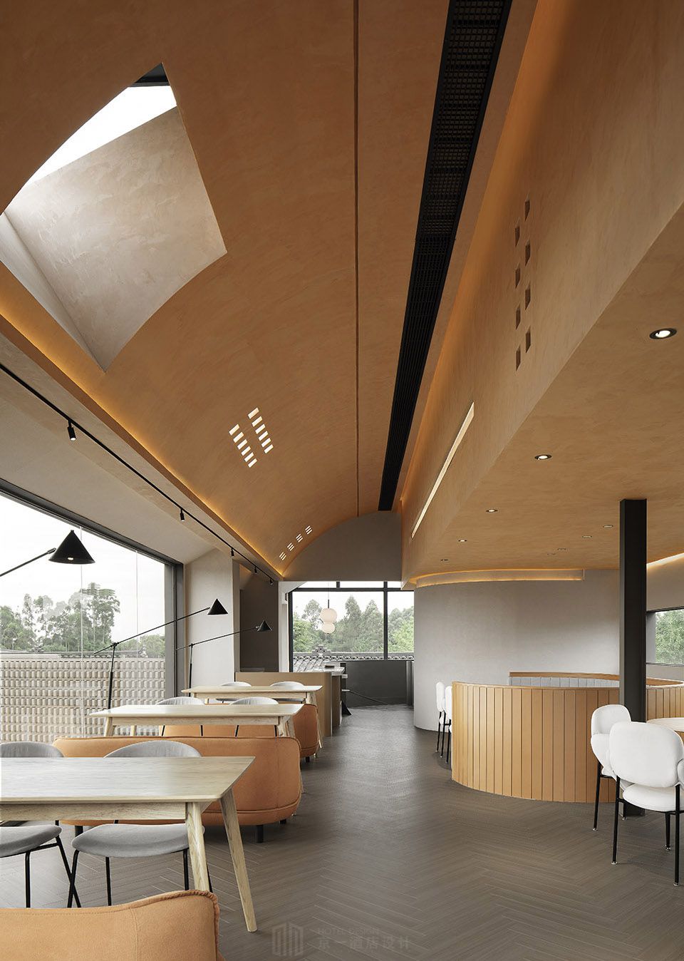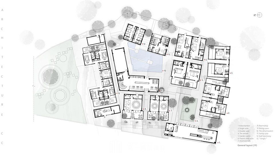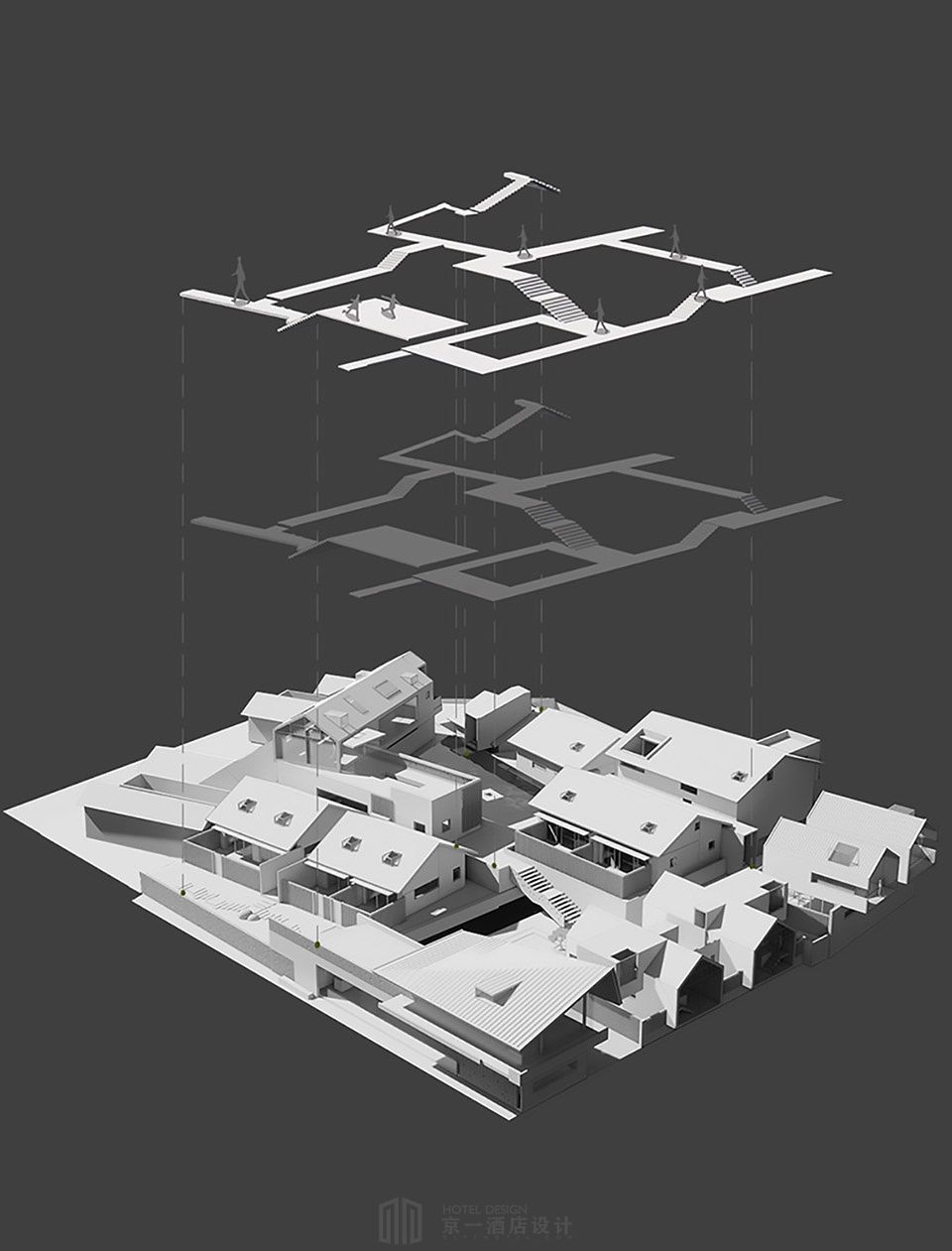 原建筑场地高低错落,形成了自然且富有韵律的建筑天际线。设计最大化的保留了原场地的错落感。将建筑结构做具有上下高差的多层次动线设计;为丰富主景观视野,利用坡道,楼梯等,形成多条循环动线。