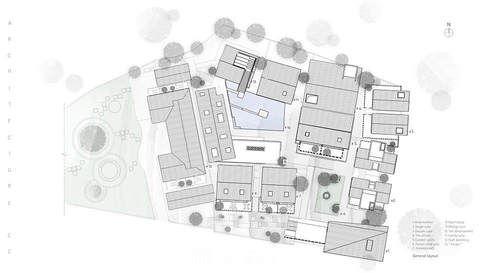 项目二期9栋建筑拔地而起。勿忘在莒,为保持当地民居的建筑韵味。综合场地现况,为减少基地大量开挖对周边土层环境的影响,故保留了原地形的高差,将四栋老建筑改造翻新,新建五栋单体建筑。其中四栋改造的建筑,把原始墙体及木结构进行了修复和结构加强。在宁静的基地与环境中重新构筑一栋庭院相间、内外相连的复合建筑群。