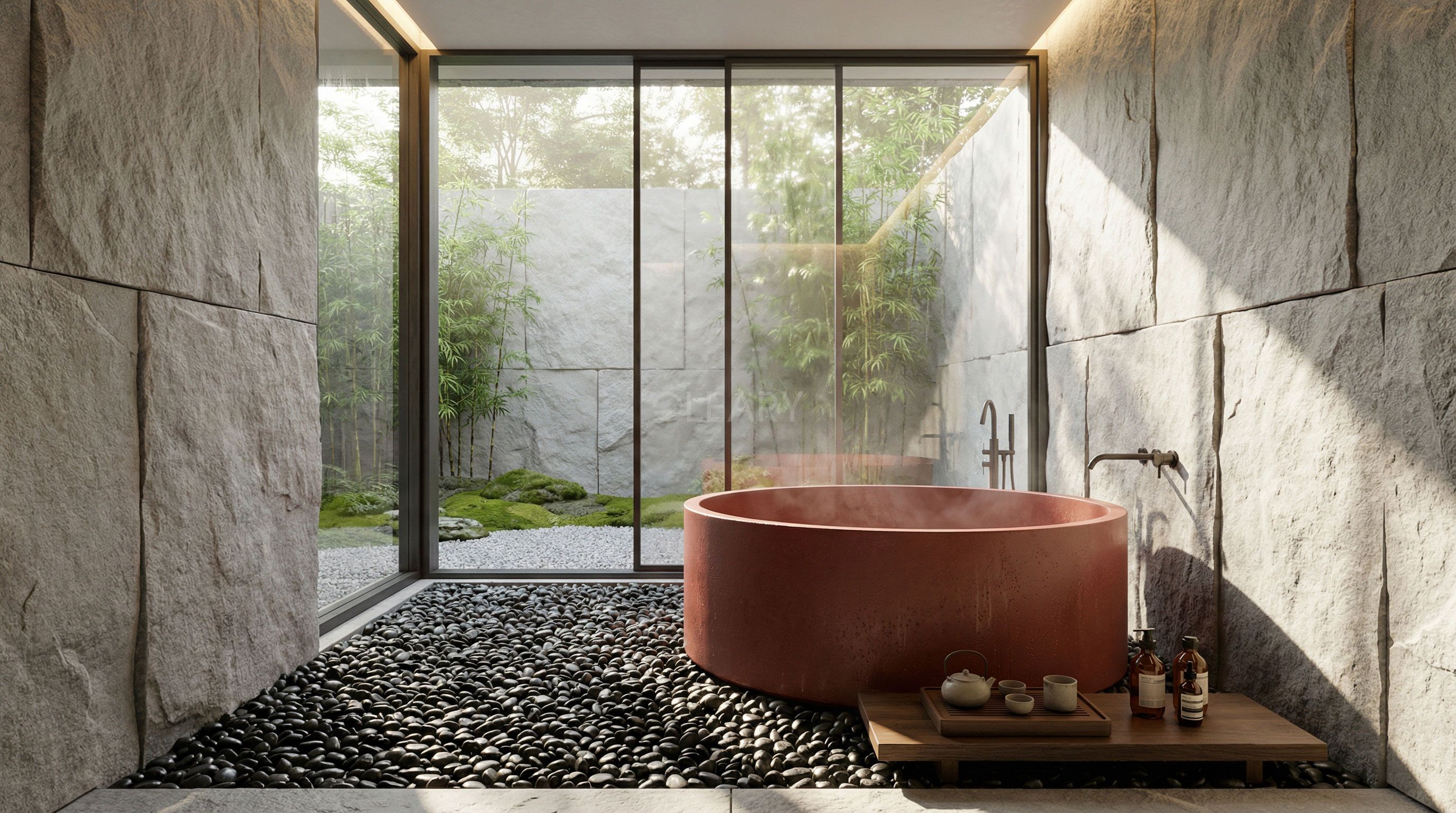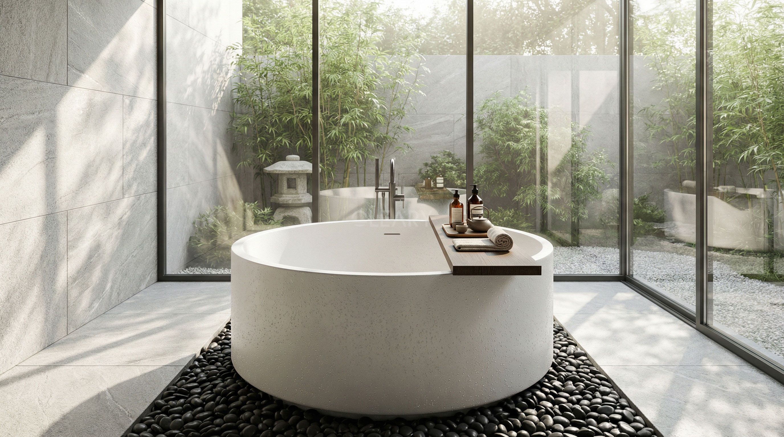 这张照片展示了一个典型的禅意风格浴室。圆形的哑光白浴缸安静地置于空间中央,下方铺着黑色鹅卵石,落地窗外是日式庭院景观。竹子、石灯笼、砾石,每个元素都透着东方美学的韵味。这种设计在高端度假酒店和精品民宿中越来越受欢迎。
