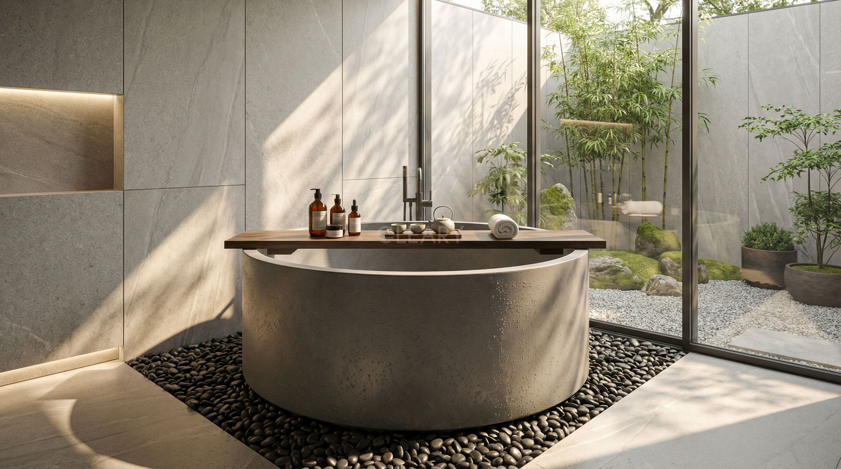 照片中浴缸的表面是哑光的,不是镜面光亮。这个选择很关键。哑光面比光面更高级,也更符合禅意美学的克制和内敛。