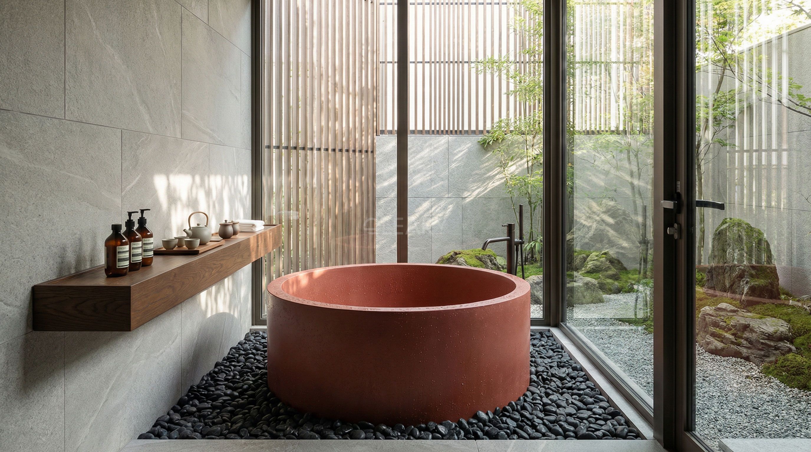 照片展示的不只是一个浴缸,而是一个完整的禅意空间。浴缸是核心,但周围的元素也很重要。落地窗、庭院景观、鹅卵石、木质托板,这些元素组合在一起,营造出禅意氛围。